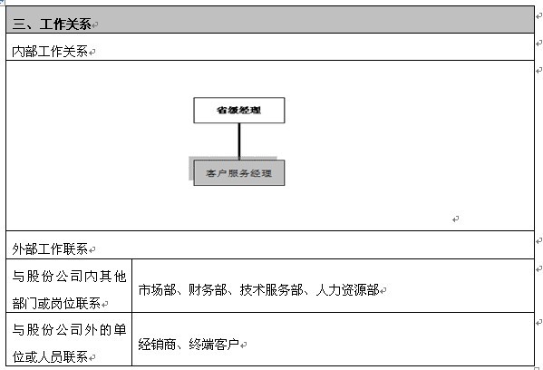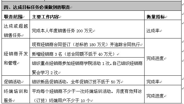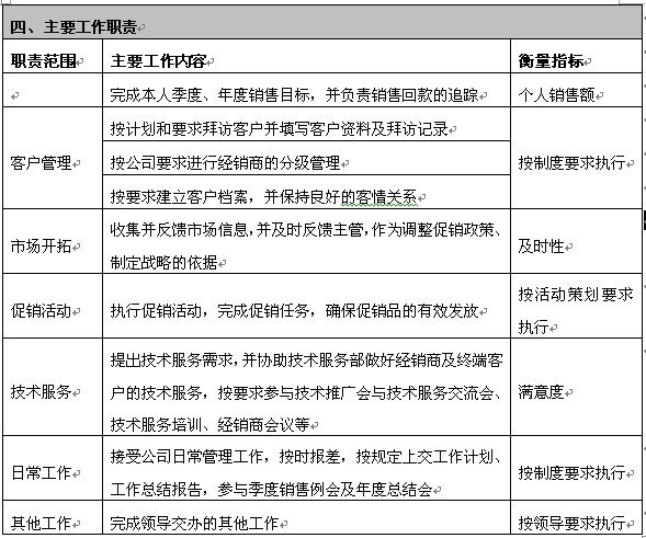 上述案例的結(jié)論是:崗位說明書的實(shí)際功能是讓銷售人員明白自己為了達(dá)成目標(biāo)要做什么?公司內(nèi)部有哪些資源可以支持他達(dá)成目標(biāo)?除此兩方面外的其它內(nèi)容,對(duì)于崗位操作人員都是無效的。因此,崗位說明書的格式及內(nèi)容,做到簡明有效就好。
