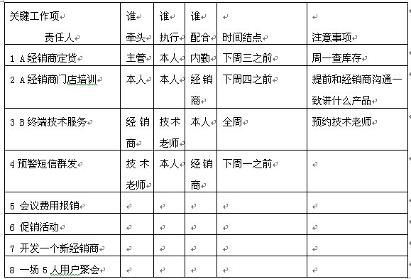 上述工作計(jì)劃表格載明了關(guān)鍵工作項(xiàng)、責(zé)任人分工、時(shí)間結(jié)點(diǎn)以及注意事項(xiàng),一線銷售人員思路清晰、行動(dòng)準(zhǔn)確,同時(shí)作為銷售主管輔導(dǎo)檢查的依據(jù)。
