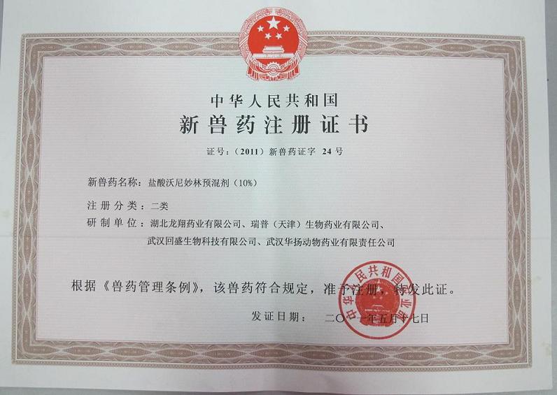 新獸藥注冊證書(鹽酸沃尼妙林)